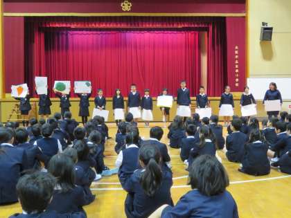 ◇給食委員の「給食の始まり」や「給食週間」についての説明につづいて、みんなで「えいようのうた」を歌いました。