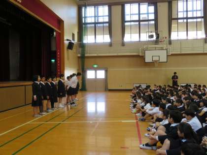 第1回目の児童集会は、前期代表委員のあいさつでした。4年生〜6年生各クラス2名の代表が、「生魂小学校が○○な学校になるように頑張ります。」と抱負をのべました。