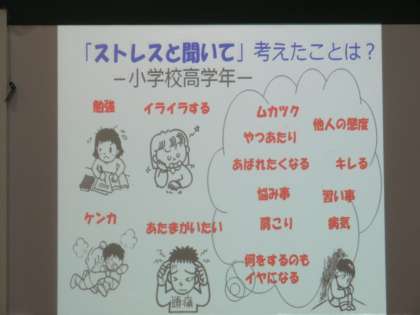 本日は、大和大学保健医療学部の古角好美先生をお招きし、「ストレスコントロール〜ストレスをうまく乗り切るために〜」というテーマで学習しました。古角先生は、以前大阪市小学校で養護教諭をされていたので、身近な例をあげながらお話しいただきました。