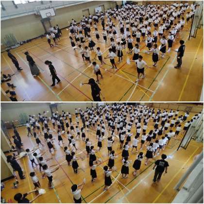 9月9日(火)には、本校で能楽本公演が行われますが、そこで行われる能「敦盛」についての解説を聞き謡をみんなでうたったり、舞を踊ったりしました。