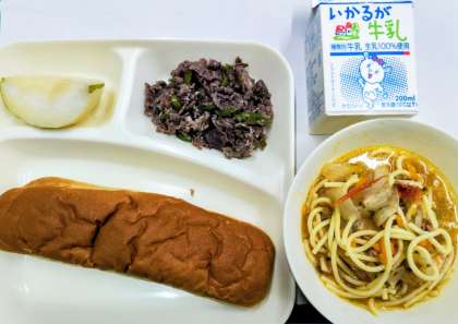 今日の給食には、旬の「日本なし(和なし)」を加工した缶詰めが出ました。