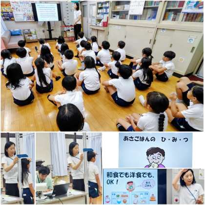 身長と体重を測った後、養護教諭の佐藤先生から「あさごはんの ひ・み・つ」について保健指導がありました。