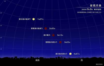今回は、9月7日の夕方に昇った満月が、8日に日付が変わった1時27分に欠け始める(部分食)に始まり、完全に月が地球の影に入る皆既は2時30分から3時53分までになります。その後4時57分に部分食が終わるまでの最大食は午前3時12分です。
