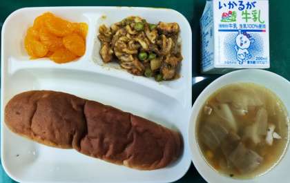 今日の給食の「カレーマカロニグラタン」は、小麦粉・牛乳・乳製品を使っていません
