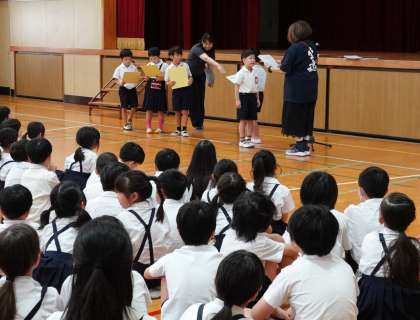 今日の児童朝会は、29人の児童の頑張りを称え、互いにその頑張りを認め合いました。