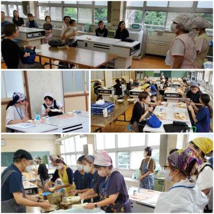 「給食室の大きな鍋、なつかしい」「おかずを入れる量がむずかしいですね」「牛乳瓶は運ぶ時、重たかったですよね」などの思い出話をしながら楽しく、また懐かしさを感じながら準備や会食をされていました。