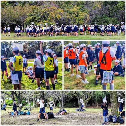 6年生がプラカードを持って、1〜4年生をたてわり班ごとに並べています。