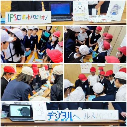 今回のミッションは、「『未来の命』をテーマにした万博パビリオンを紹介しよう」です。各クラス5つのパビリオンを考え、万博パビリオンが開催されました。