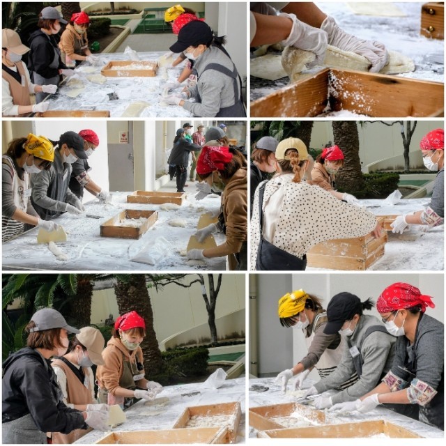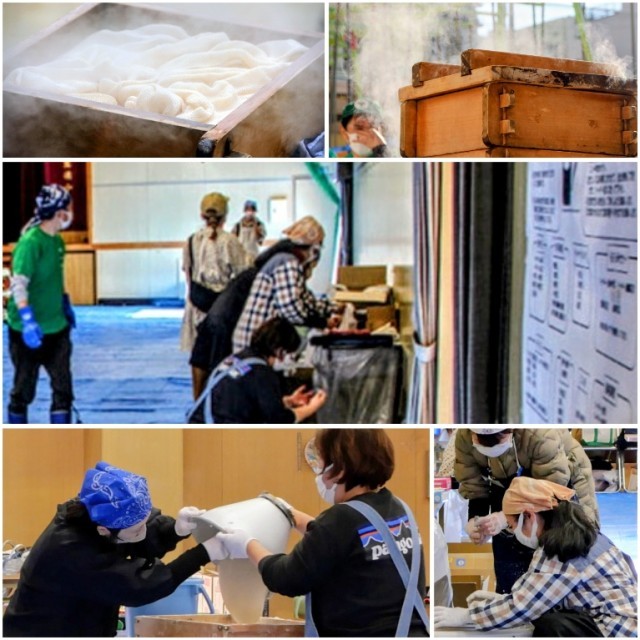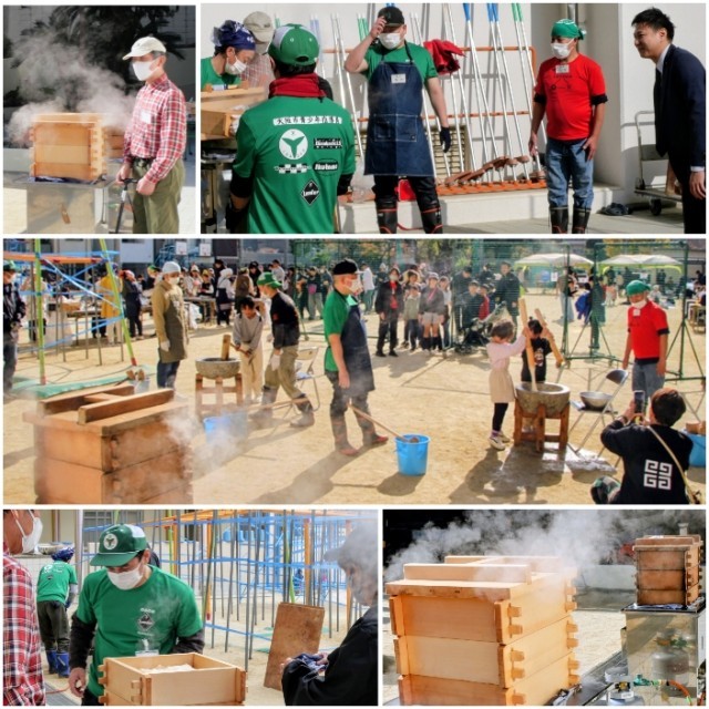 前日に水につけておいたもち米を蒸し器と臼でつく他に、電動餅つき機を併用して、当日準備を進めてくださいました。
