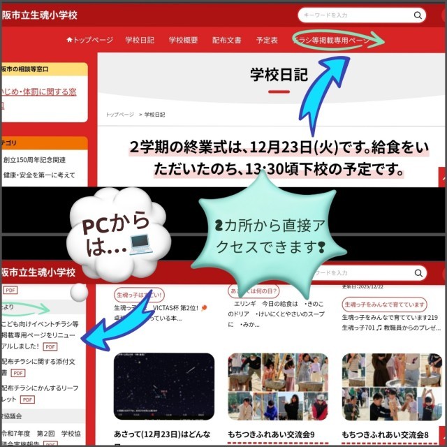 さて、大阪市立の学校園では、令和7年7月より、団体等から配付依頼のあったイベント等のチラシや情報誌等の個別配付を取りやめ、データによる掲載へ移行したところでございます。このたび、保護者の皆様により便利に活用いただくため「チラシ等掲載専用ページ」をリニューアルいたしました。