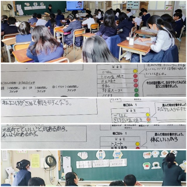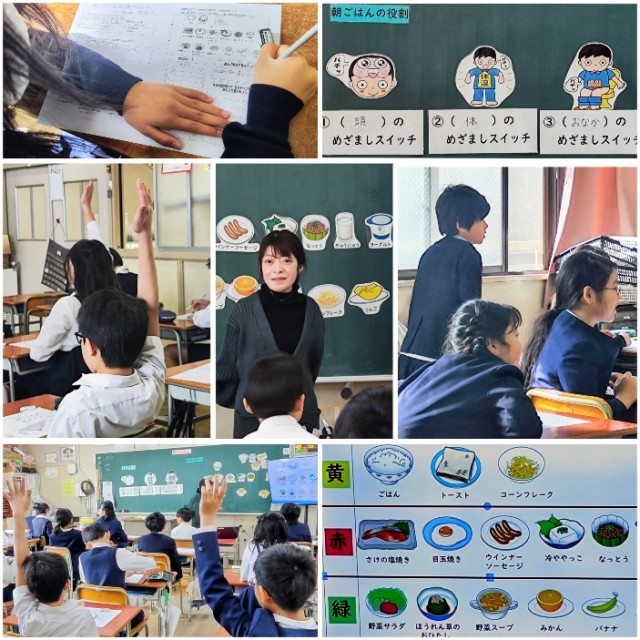 本日は、真田山小学校の栄養教諭の先生が来校くださり、「朝食を考えよう」をテーマにバランスのよい朝食をみんなで考えました。