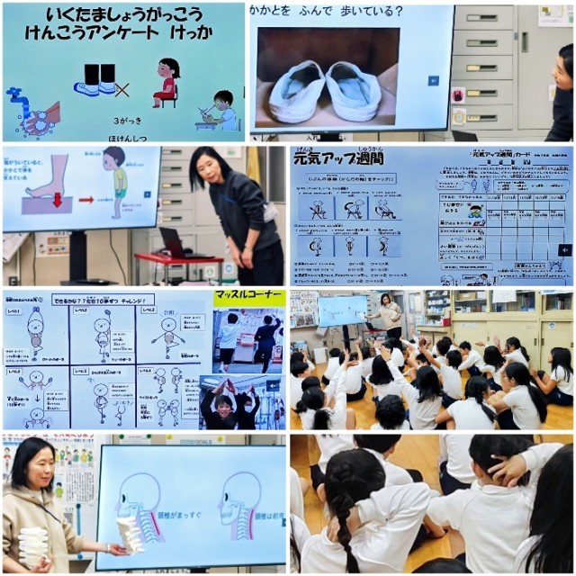 今学期の保健指導は「健康アンケートの結果から」ということで、「姿勢」をテーマに1学期・2学期に学んだことを振り返っていきました。また、「首」にも注目し、考えていきました。