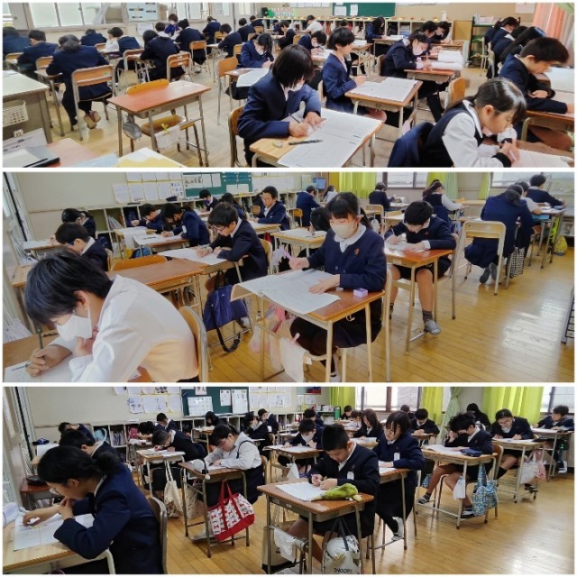 本校では、毎週水曜日の朝学習を「漢字タイム」とし、自ら目標を設定して漢字プリントに取り組んでいます。3学期に入ると、すきま時間にも熱心に、廊下に設置しているトレーから自由に「漢字プリント」を選んで取り組む姿が見られました。