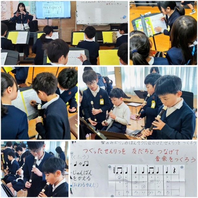 設定した条件に基づいて、2/4拍子の1フレーズをところどころ8分音符に変えてみたり、一人ひとりが考えた1フレーズの順番を考えたりしながら、生み出される曲の良さや面白さに夢中になって工夫していました。どの児童も音楽づくりの学習をとても楽しんでいました。