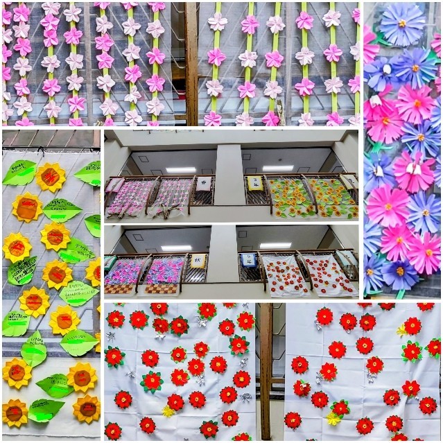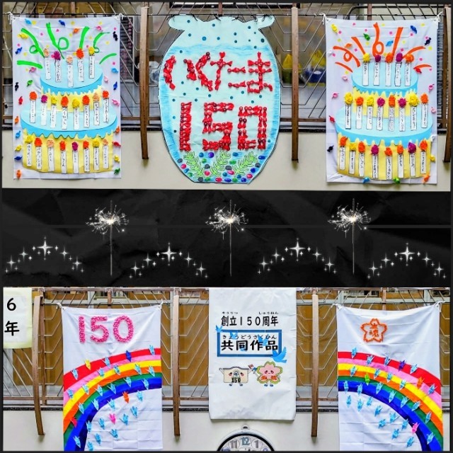 150周年をお祝いするために、ケーキと春夏秋冬の花と、未来へはばたく鳥をイメージして全校生で作成し、エントランスの2階に飾っています。作品には、児童の名前と、将来の夢や平和を願った各学年のメッセージを飾りました。