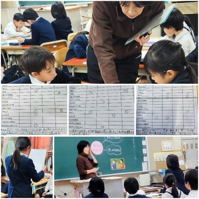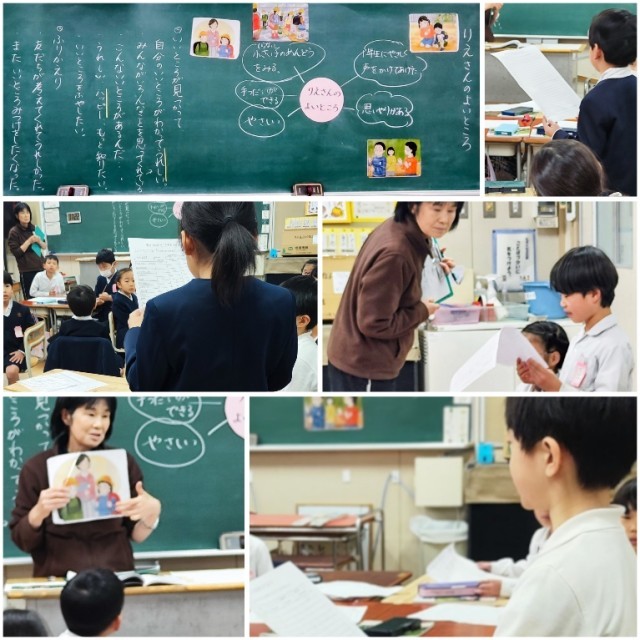 本日の3限目は、2年1組の教室で、道徳教材「りえさんの いいところ」の授業公開をしました。