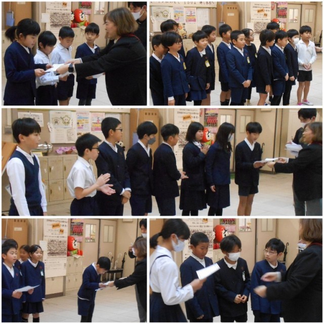 児童朝会でその頑張りを称え、エントランスで記念写真を撮りました!
