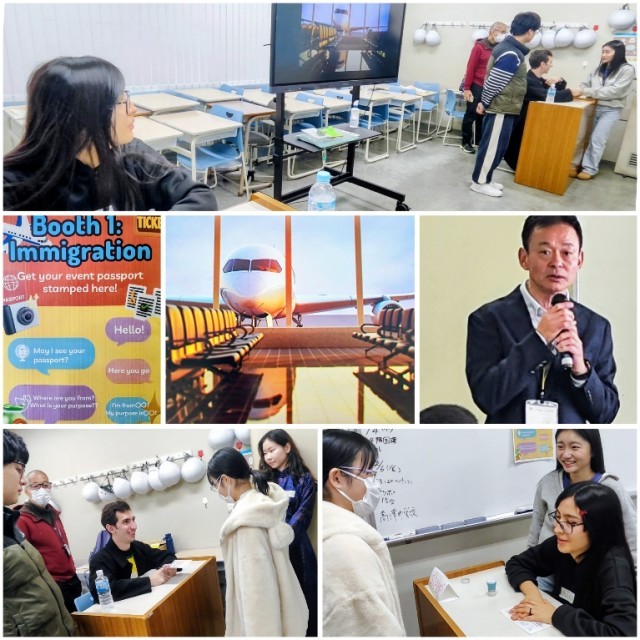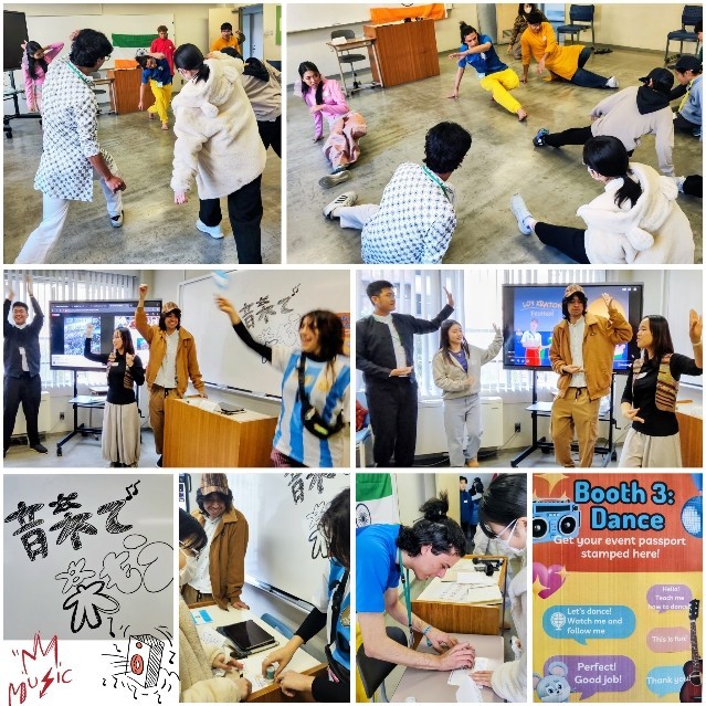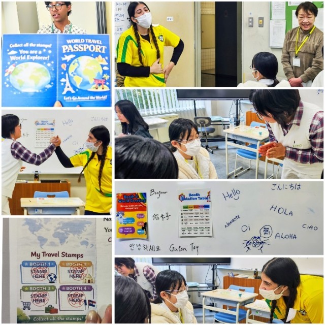 他校や異学年の友だちとグループを作り、Immigration・Shopping・Dance・Music・World Greeting の5つのBoothを周って学びました。