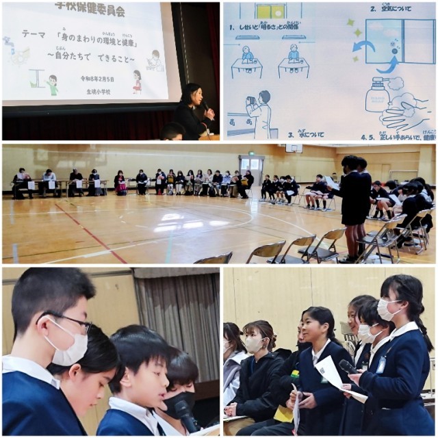 今年度の学校保健委員会では、「身のまわりの環境と健康について」をテーマにサブテーマを「自分たちで できること」として、健康委員会の児童が中心となって発表しました。