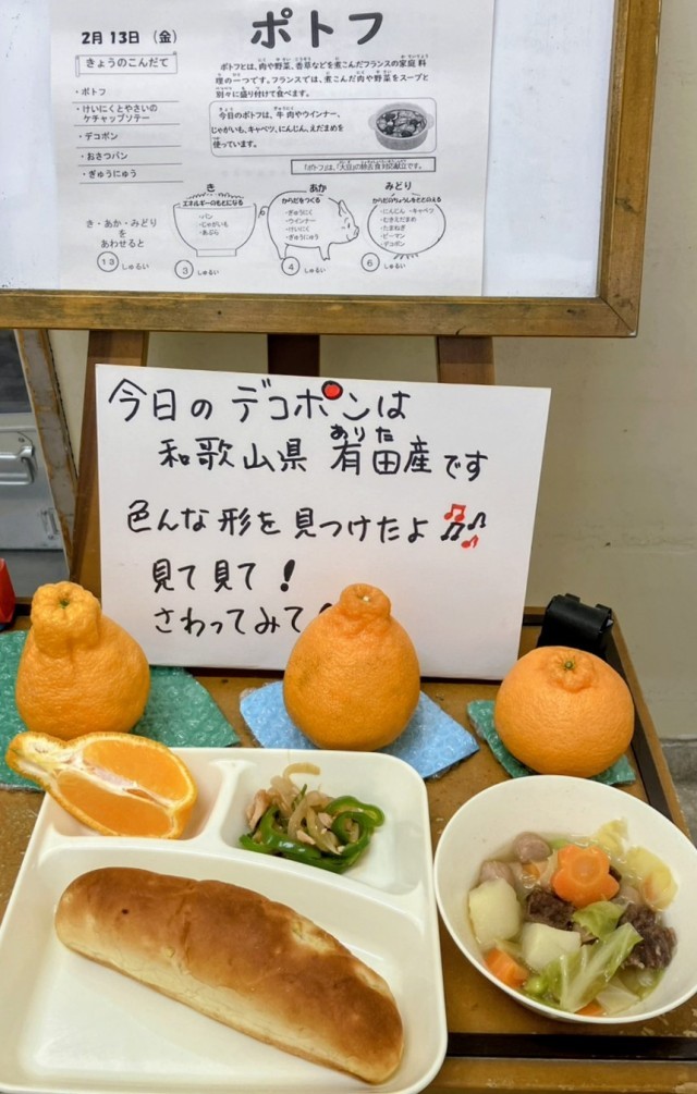 今日の給食の「ポトフ」は、牛肉やウインナー、じゃがいも、キャベツ、にんじん、えだまめを使っています。