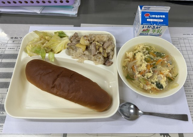 給食では、焼き豚、くり、しいたけ が入った「中華おこわ」です。