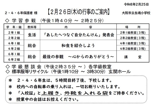 2・4・6年生 学習参観・学級懇談会のお知らせ