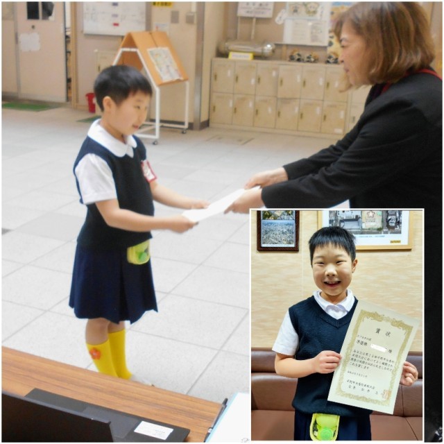 素晴らしい頑張りを児童朝会で表彰し、校長室で記念写真を撮りました。