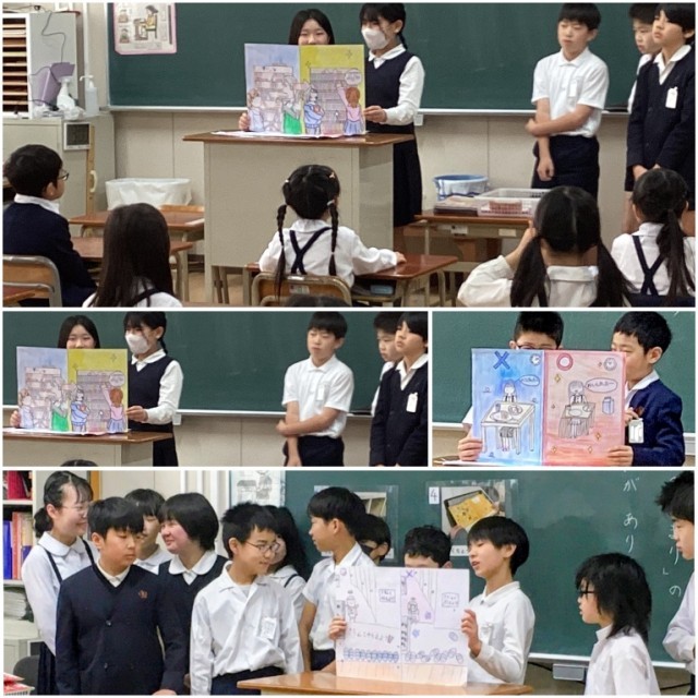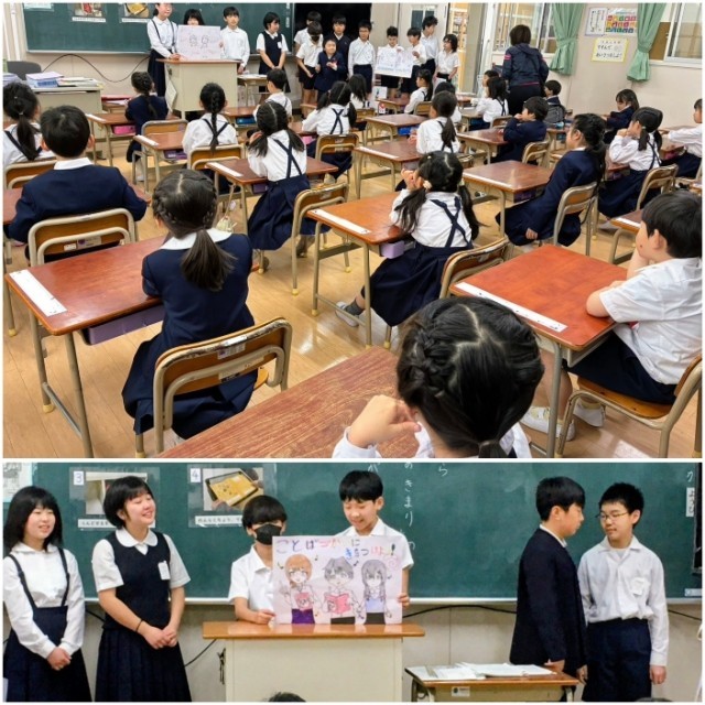 それぞれの班で作成した紙芝居を、朝の会の時間に1年生の前で発表しました。
