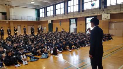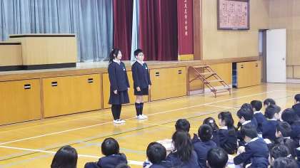 新転任の教職員と担任等の発表を行いました。新しい学年がスタートしました。6年生代表から、「みんなで笑顔輝く学校にしたい」と進級のことばがありました。1年間元気に頑張りましょう。よろしくお願いします。