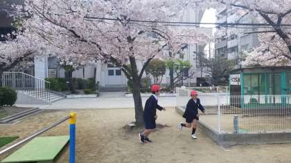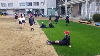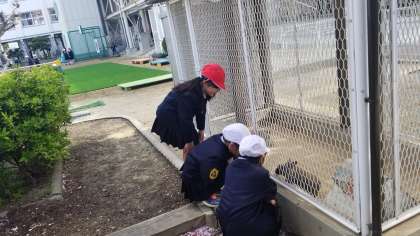 登校後の朝の様子です。ウサギの観察や人工芝で遊んでいます。
