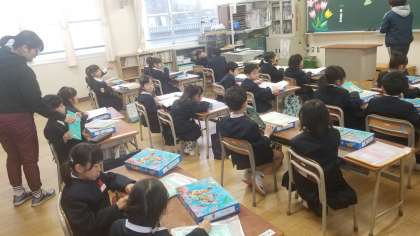 教材の確認や健康観察などを行います。1年2組は英語の学習をしていました。