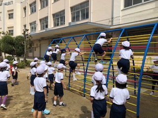 1年生の体育学習の様子です。少し肌寒かったけれど、元気いっぱい活動しています。