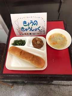 今日の献立です。給食が始まってから「やきそば」「カレーライス」「ハンバーグ」と,子どもたちに人気の高い献立?が続いていますね。