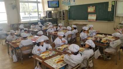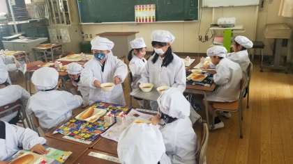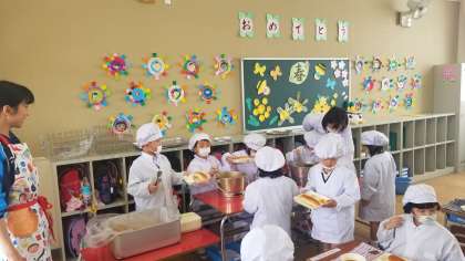 1年生の給食の様子です。1年生は慣れるまで、他の学年より早く給食を始めます。自分たちで配膳することができていました。