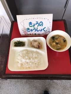 今日の献立は、豚肉のおろしじょうゆかけ、みそ汁、じゃこピーマンです。いただきます。