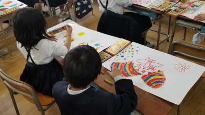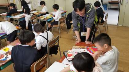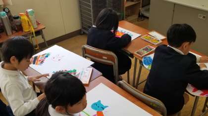 2年生1・2組の図工の様子です。卵の中から飛び出すものを創造して描いています。