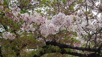 地下道をあがった所の桜です。頑張って咲いている桜の花の後には葉桜の緑がきれいです。確実に夏が近づいています。