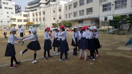 朝の様子です。人工芝で1年生と2年生が仲良く鬼ごっこをしています。