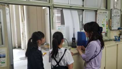 職員室では委員会の児童が放送をしています。