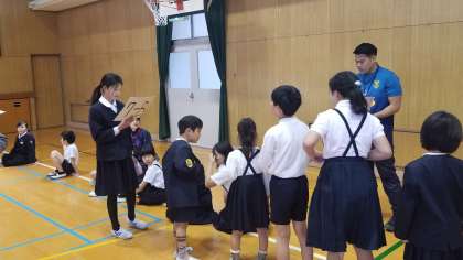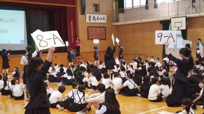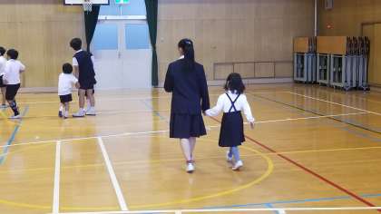 本日児童集会を行いました。今日の集会は縦割り班編成です。6年生が1年生の手をひいて案内しています。