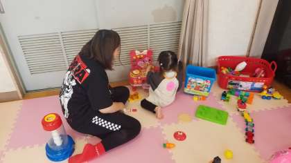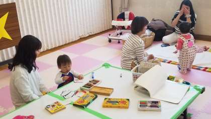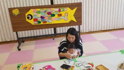 こいのぼりのうろこの部分に色を塗りました。お母さんも子どもたちもとても楽しそうです。小学校の児童も興味深く扉から中をのぞいていました。