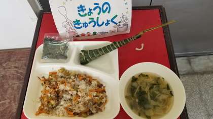 今日は子どもの日の行事献立で、「ちまき」がつきます。ちまきは米の粉などで作ったもちを笹の葉にくるみ、蒸して作ります。みなさん、「ちまき」を食べて元気で大きくなりますように。