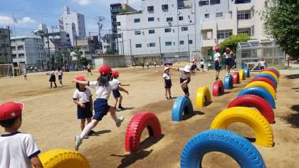 休み時間の様子です。いっぱい遊んでいます。担任の先生も参加して遊んでいます。