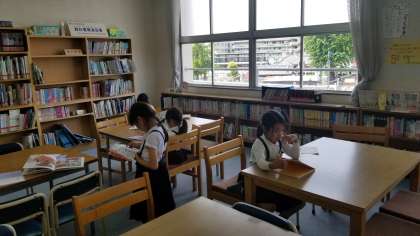 2年1組の授業の様子です。図書室で本を読んでいます。各自が好きな本を選んで、静かに読んでいました。