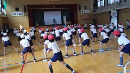 5時間目、体育館で3・4年生が運動会の練習をしました。まだ完成度は低いですが、頑張っています。