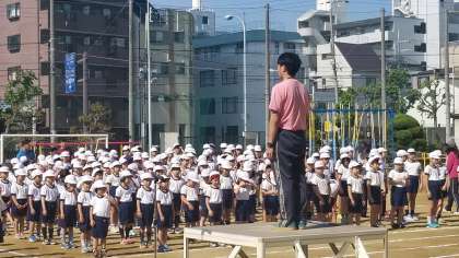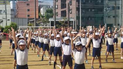 本日運動場で体育朝会を行いました。ラジオ体操と児童席への入退場の練習をしました。