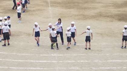 5・6年が運動場で運動会の練習をしています。