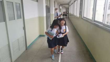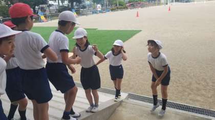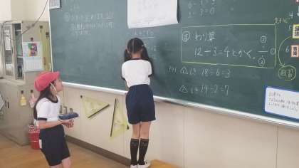 「先生、今はやってる遊び」と教えてくれました。水上スキーのように遊んでいました。他にもいろいろ工夫して遊んでいます。係の仕事をしている児童もいました。
