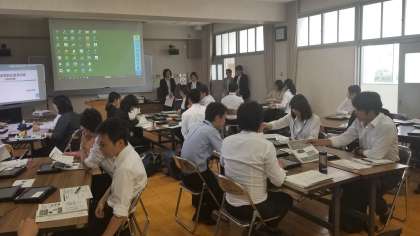 授業参観の後、多目的室でICT活用の実技研修を行いました。新規採用の先生方が、ICT活用の方法をタブレットを使って実際に研修しました。