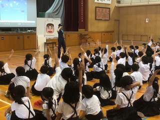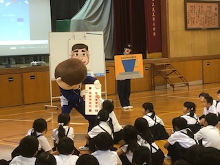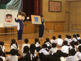 3時間目は、全校一斉の防犯教室です。天王寺警察署の婦警さんに来ていただいて、誘拐被害にあわないために自分でできることを教えていただきました。着ぐるみさん(誘拐犯役)や大きなパネル、ビデオなどを使ってわかりやすく楽しく身を守る方法などを伝えていただきました。